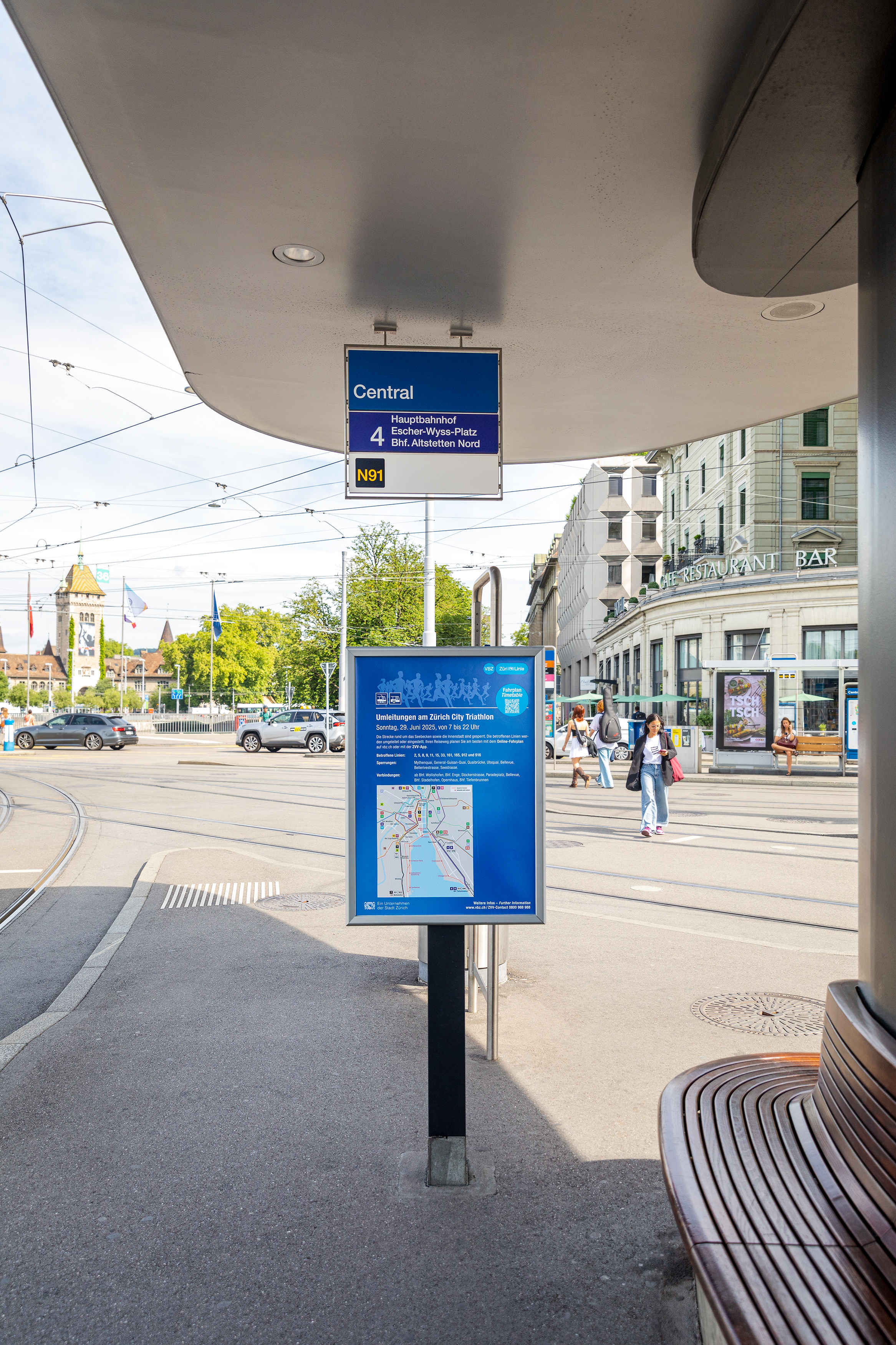 sehr viel leichter, nämlich lediglich 25 kg schwer. Und sie sind sehr einfach zu montieren», sagt Garcia. Die Pointe ist aber nicht oberflächlich, sondern im Boden zu suchen. An besonders stark frequentierten und zentralen Plätzen wie dem Bellevue, Stauffacher, Central, Paradeplatz und einigen weiteren wurden nämlich Bodenhülsen einbetoniert, in welche die Stelen ganz einfach eingeschoben werden können. Zum Schutz verfügen die Bodenhülsen über einen Deckel,der das Eindringen von Schmutz bei Nichtgebrauch verhindert. Der Deckel ist magnetisch befestigt und lässt sich einfach aufklappen und schliessen.Die Stele wird in die Bodenhülse eingeschoben und dort mittels einer Schraube sicher arretiert.